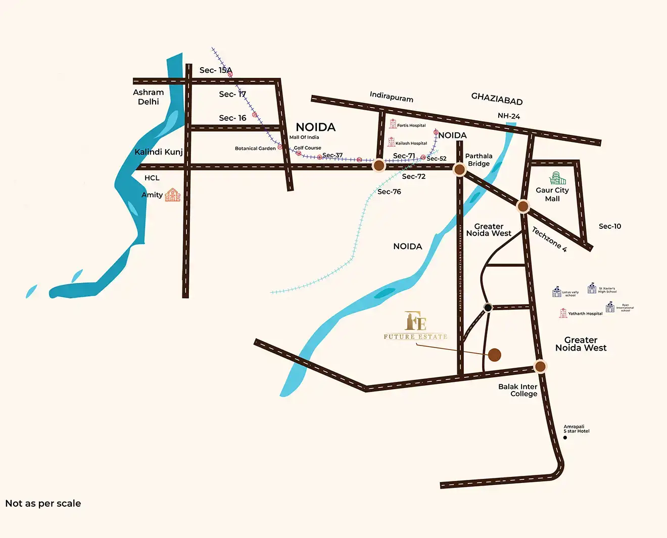 Strategically situated in Sector 1 Greater Noida West, Future Estate offers superb connectivity to Noida, Delhi, and Ghaziabad via major highways such as NH-24 and the FNG Expressway. The proposed metro station is also within close proximity, ensuring easy and quick commutes.